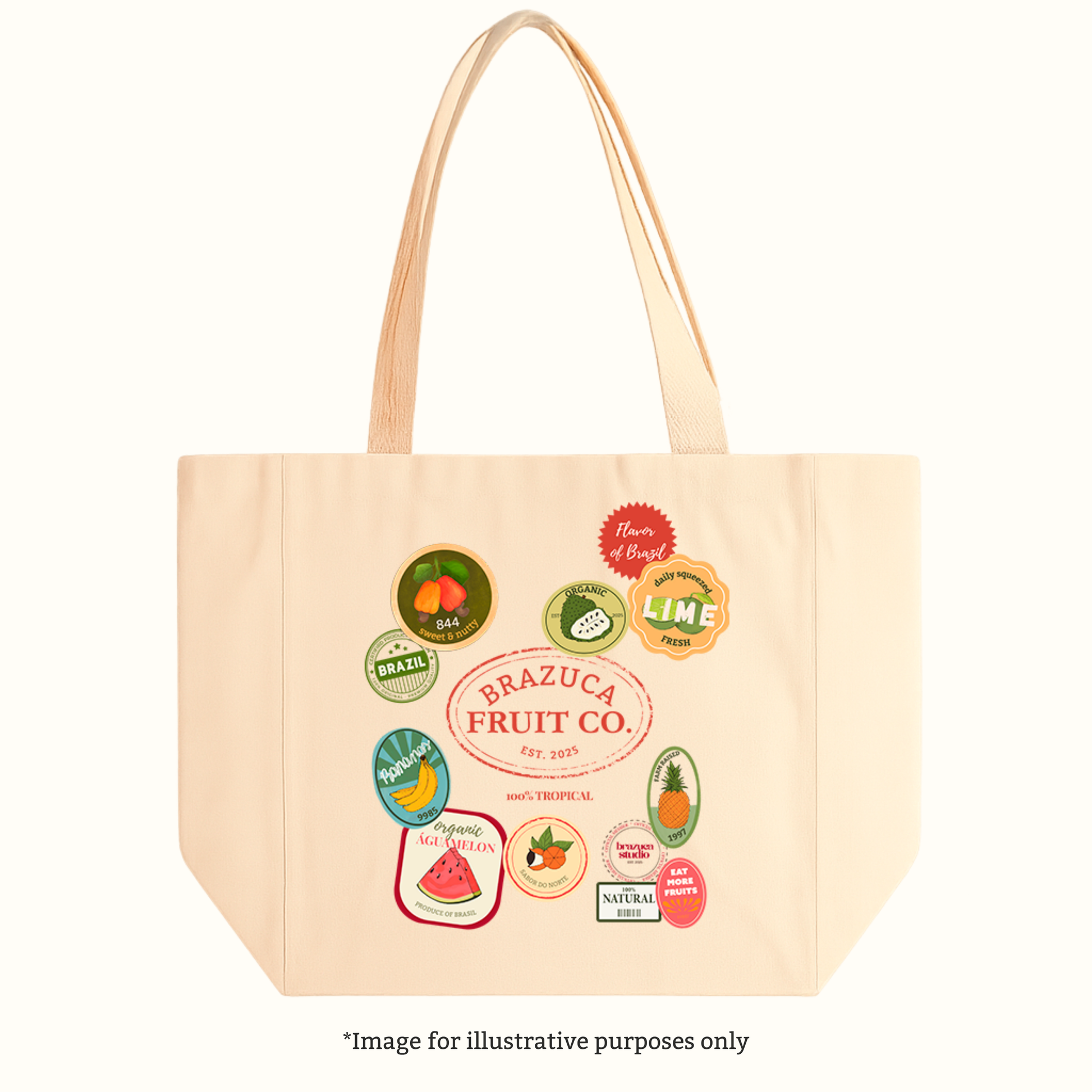 Celebrate the flavors of Brazil with the Brazuca Fruit Co. Tote. This natural canvas bag features colorful, vintage-style fruit labels—including guaraná, caju, lime, pineapple, and watermelon—centered around the Brazuca Fruit Co. logo.